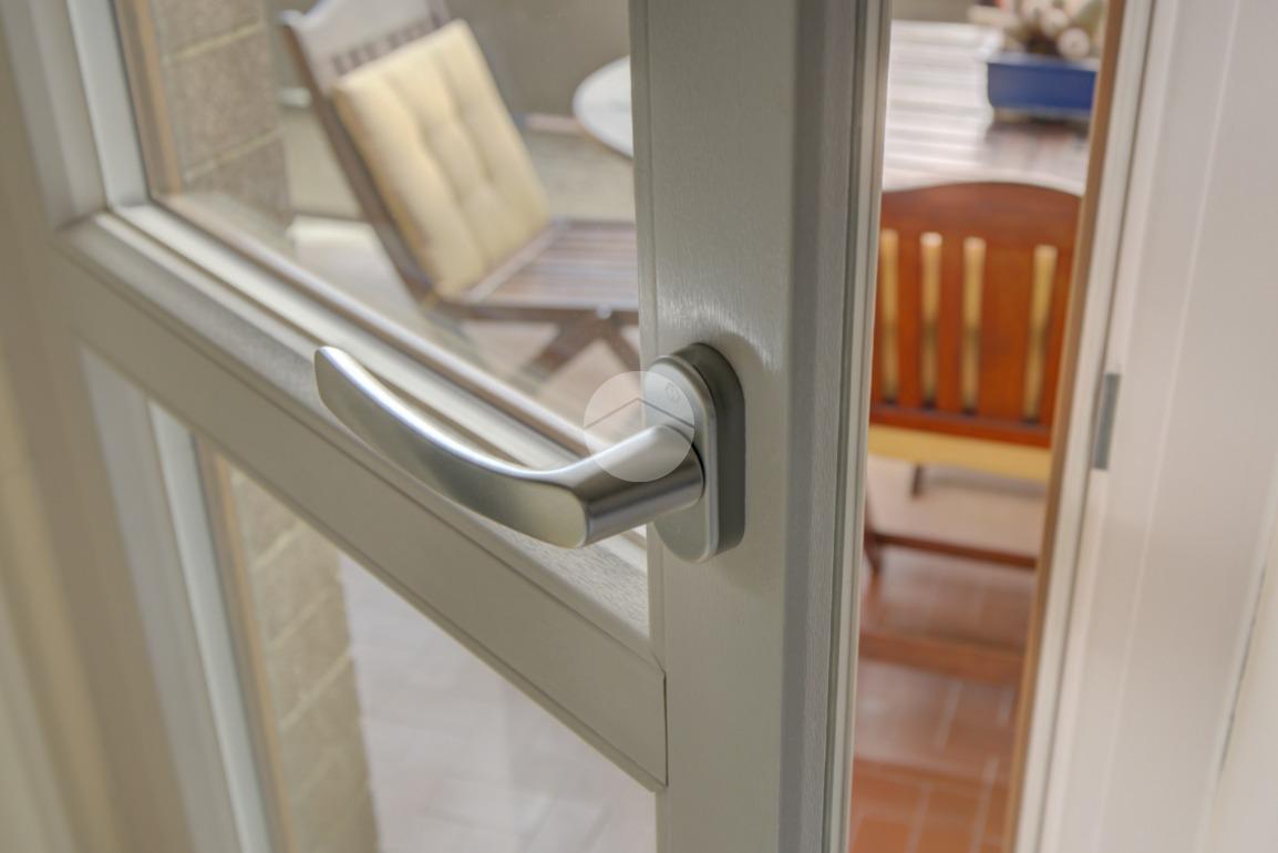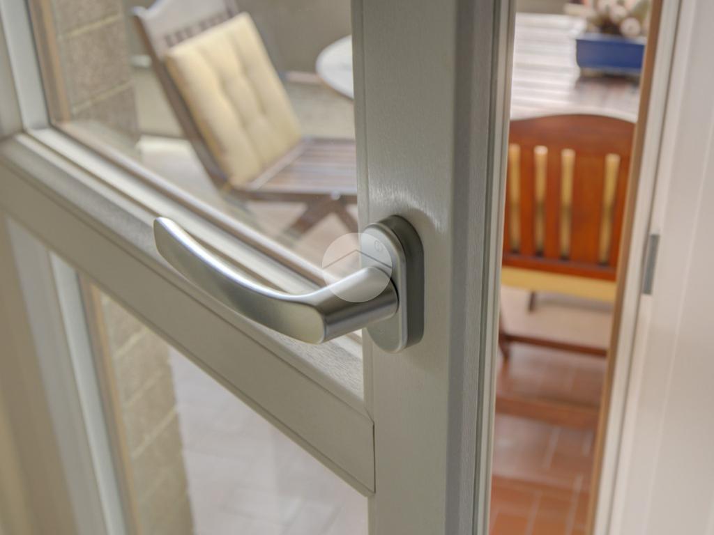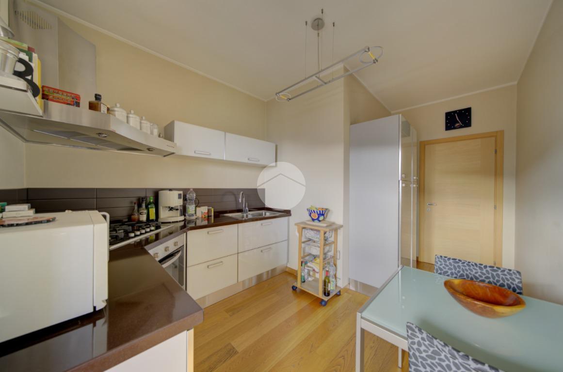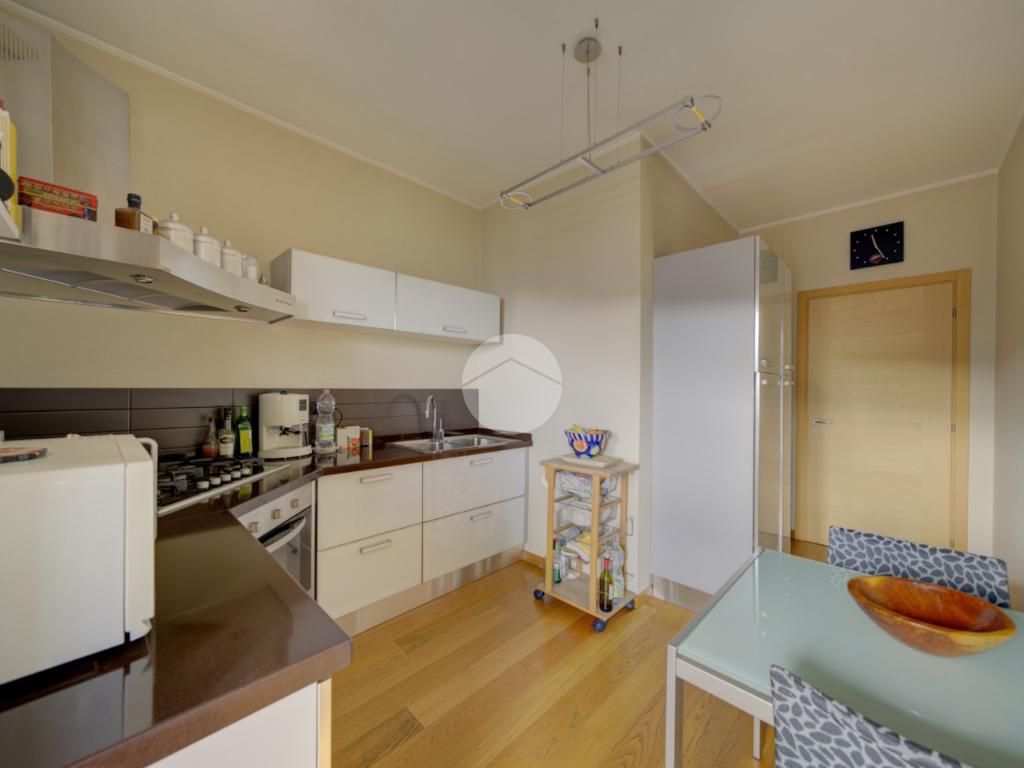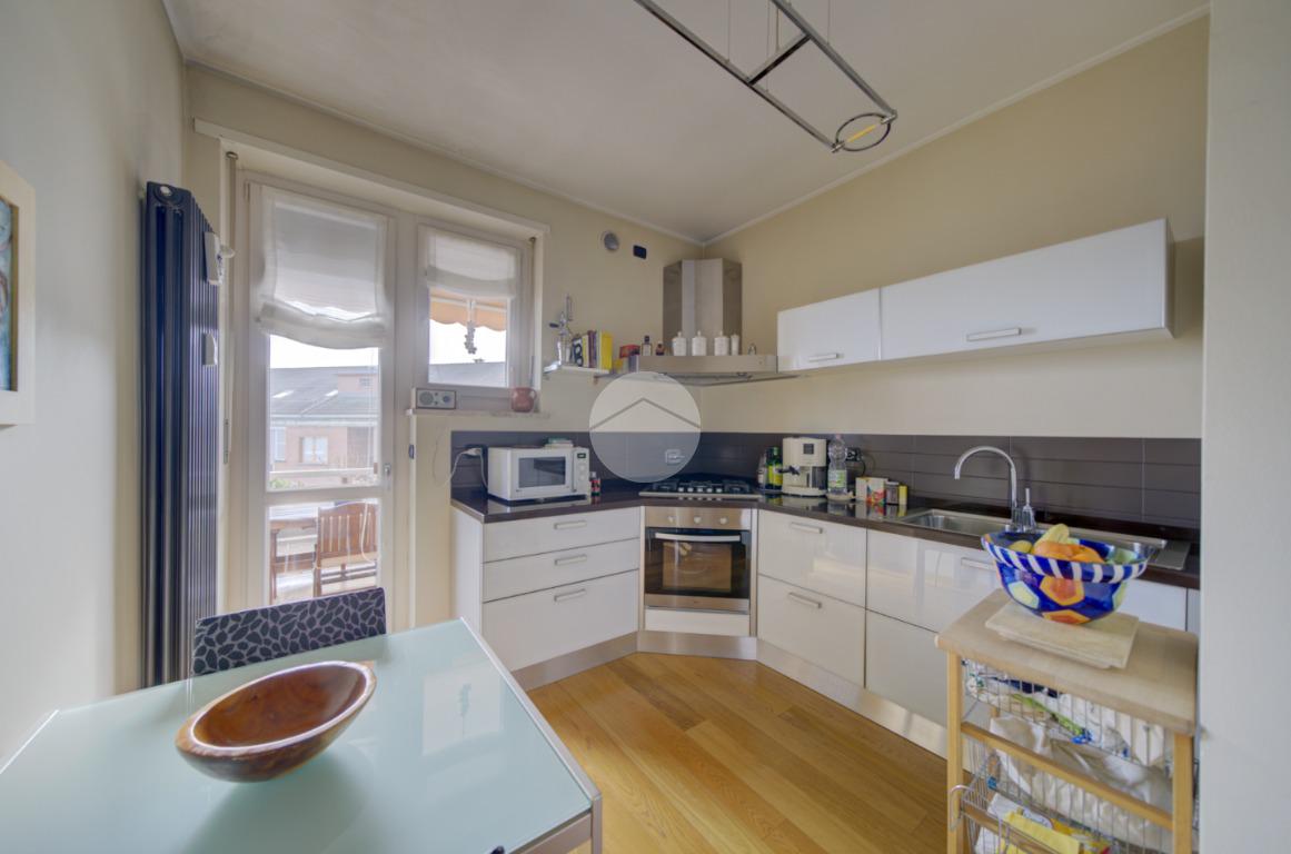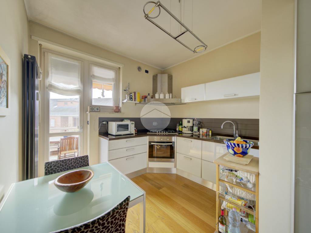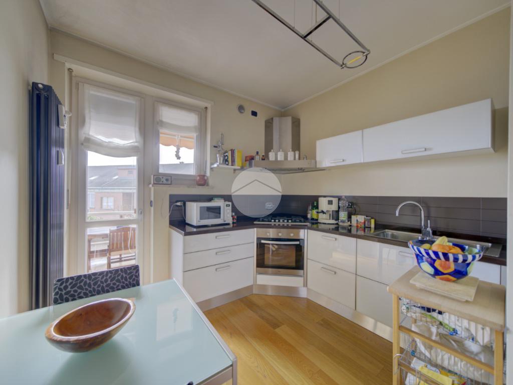 Cucina abitabile con accesso diretto a un terrazzino vivibile, ideale per cene all’aperto durante la bella stagione.